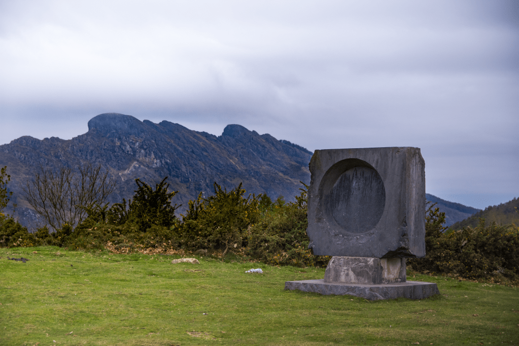 Está en un lugar especial, rodeado de pequeñas piedras en forma de cromlech, con una pequeña capilla a unos metros, en un pequeño alto de terreno rodeado de montañas. No existe ninguna indicación para localizarlo. Se intuye que estás cerca del lugar por la existencia de un espacio habilitado como párking. Paz. Belleza. Éxtasis. Misticismo. Conexión cósmica. El monumento simboliza un cromlech dentro de un cuadrado. En el año 1992, un ex alumno de Oteiza le arreó con un martillo y lo dejó en su situación actual. El maestro Oteiza se negó en redondo a restaurar la obra. A pocos metros está una pequeña capilla diseñada por el arquitecto Luis Vallet.