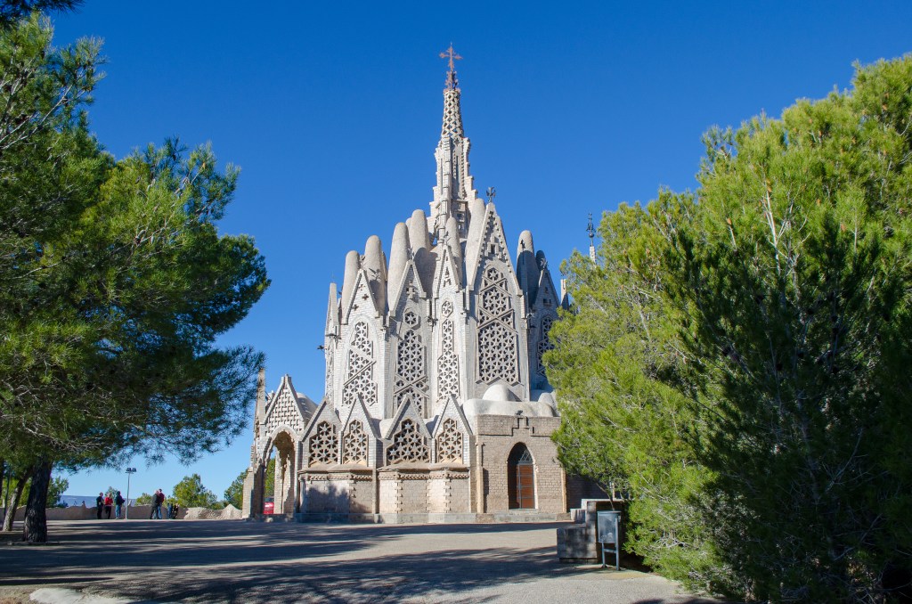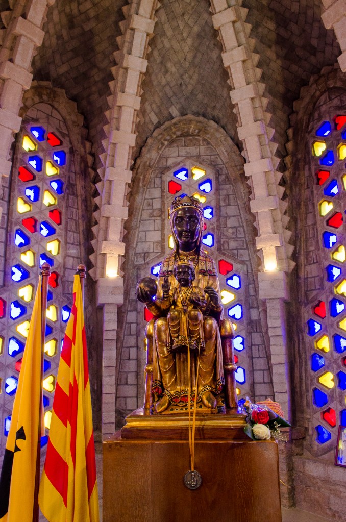 Descendiendo al siguiente círculo de misterios marianos, encontramos las vidrieras del Santuario de la Mare de Déu de Montserrat en Montferri. Montferri es un municipio de 429 habitantes ubicado en la comarca de l’Alt Camp en la provincia de Tarragona, cuyos habitantes tenían por costumbre peregrinar a Montserrat cada año después de la vendimia. El jesuita Daniel María Vives, natural de esta localidad, tuvo en los albores del siglo XX un pensamiento mágico mientras rezaba en la Basílica de Montserrat y después de haber estado retirado en la cueva de Manresa en la que San Ignacio de Loyola escribió sus «Ejercicios Espirituales». Debía construir, en Montferri, un santuario para albergar una réplica de la Virgen de Montserrat y de esta forma facilitar la peregrinación de sus devotos conciudadanos, es decir quitarles la excursión anual a los campesinos de la zona. Una vez obtenido el terreno, en un alto a 400 metros del pueblo, contactó con Josep Maria Jujol, el que fue discípulo y colaborador de Antoni Gaudí, cuya abuela era natural de Montferri y tía del propio Vives, para que planificara y dirigiera el proyecto.