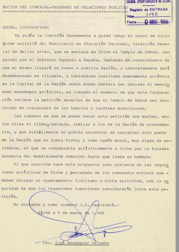 - Moción de fecha 22 de febrero de 1966 de la alcaldía de Elche a la Comisión Permanente del ayuntamiento para que valore la conveniencia de solicitar a la Dirección General de Bellas Artes del Ministerio de Educación Nacional la instalación del templo que sea ofrecido a España en Elche, por tratarse del lugar idóneo dada las características de su ciudad.